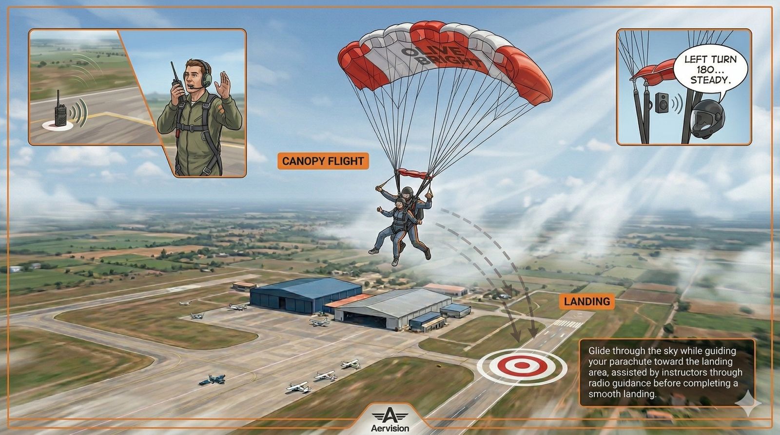 Glide through the sky while guiding your parachute toward the landing area, assisted by instructors through radio guidance before completing a smooth landing.